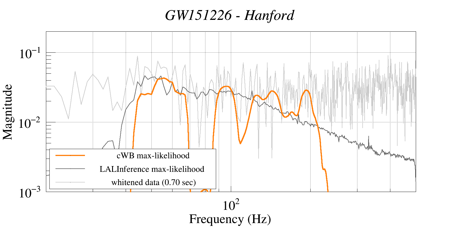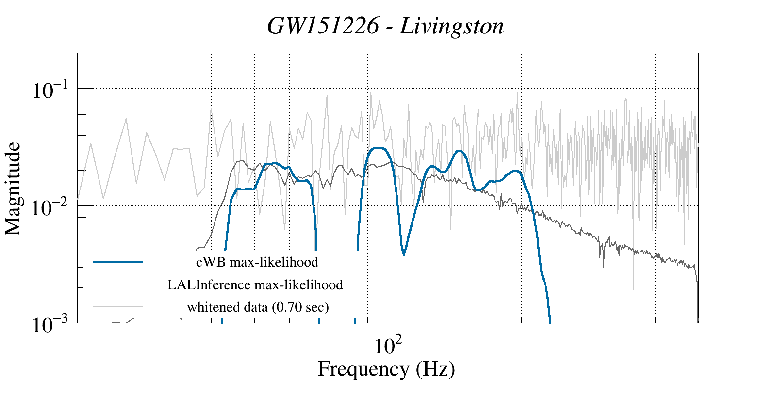 (cWB max-likelihood) vs (LALInference max-likelihood) vs (whitened data 16:512 Hz)