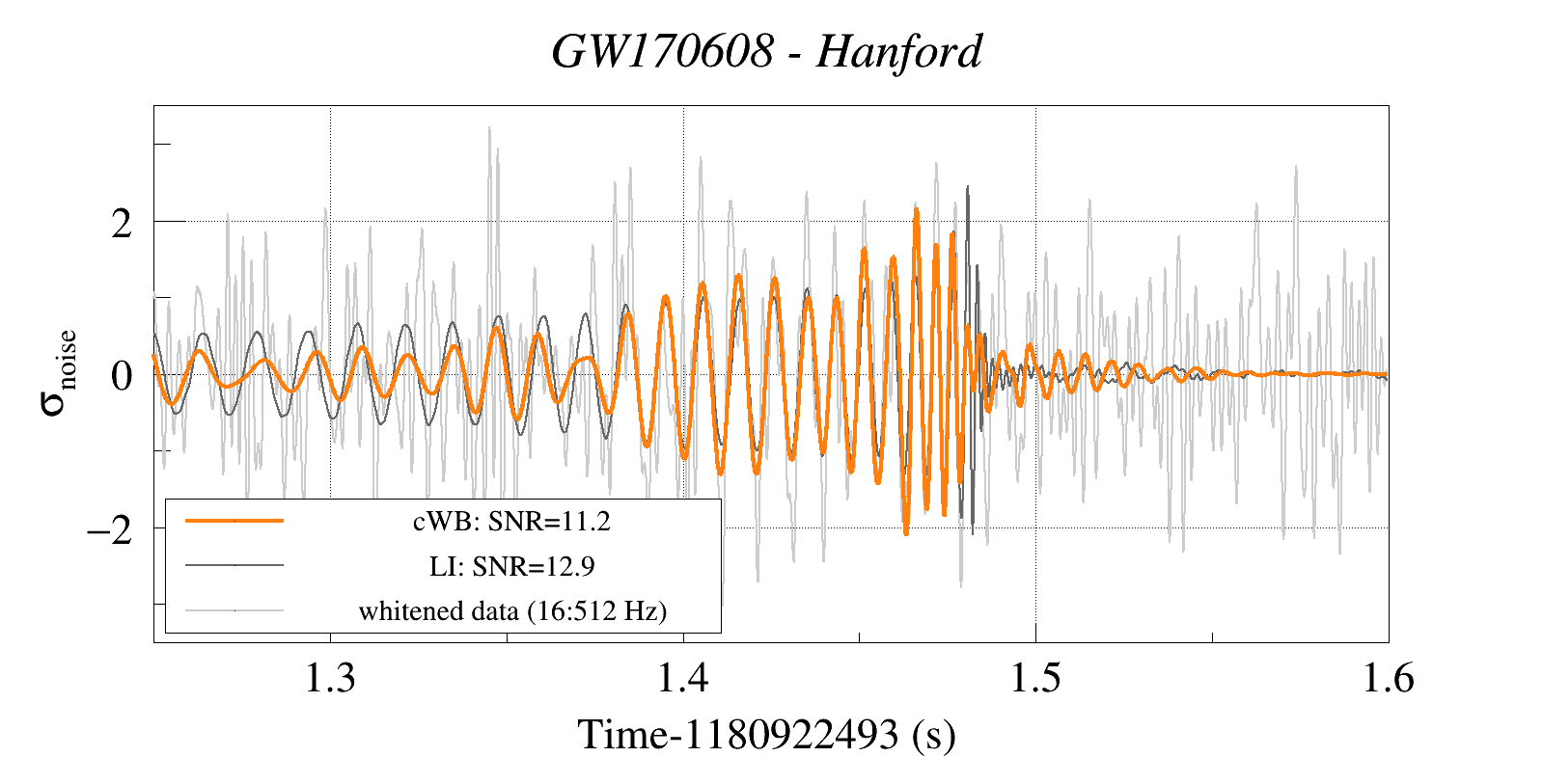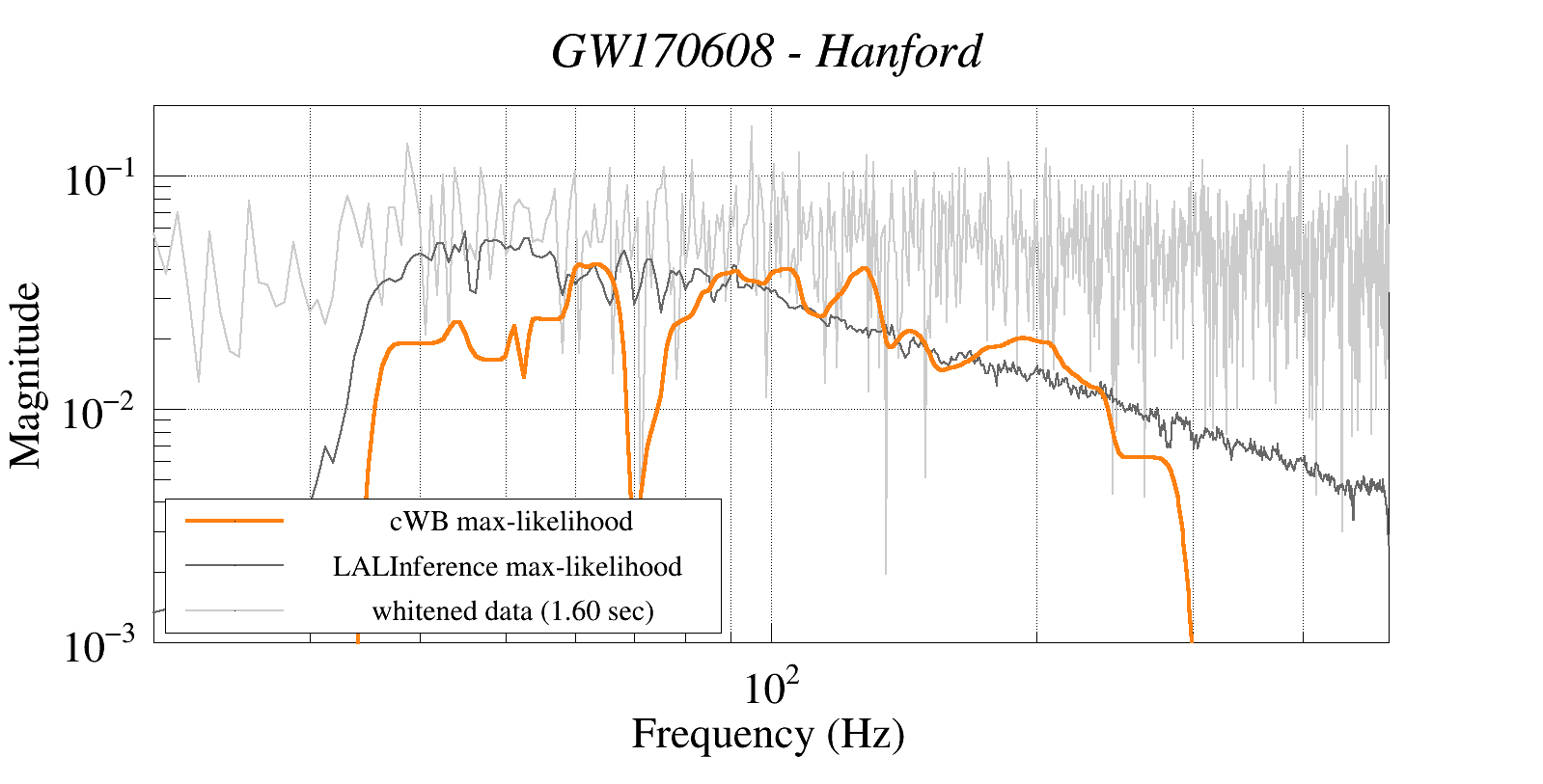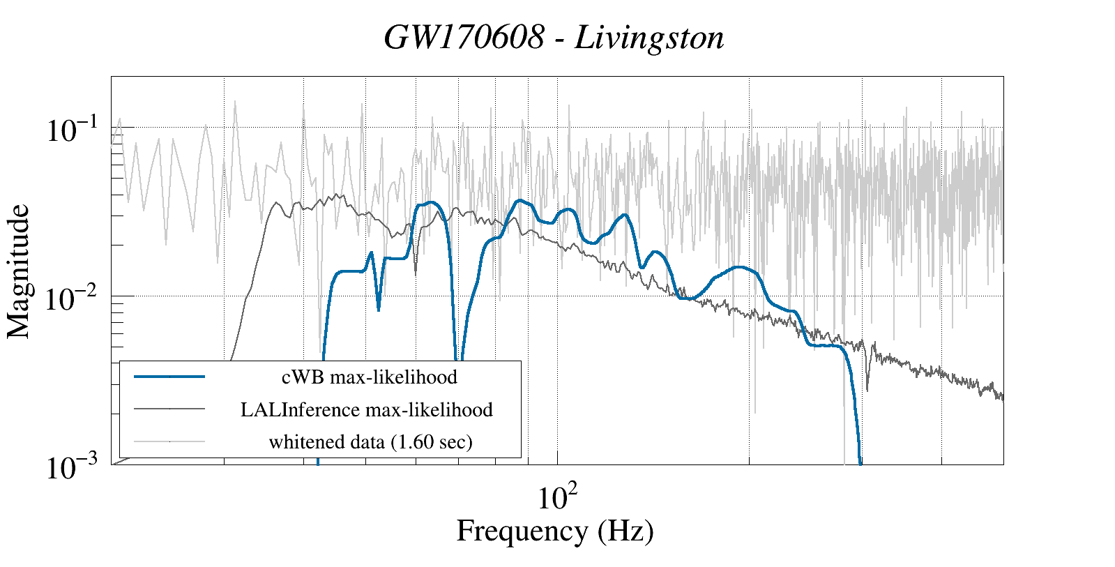 (cWB max-likelihood) vs (LALInference max-likelihood) vs (whitened data 16:512 Hz)