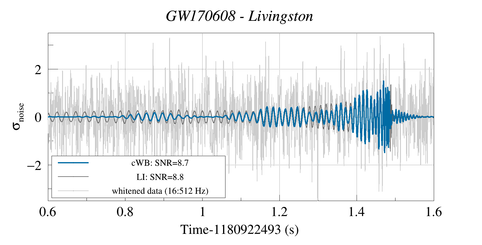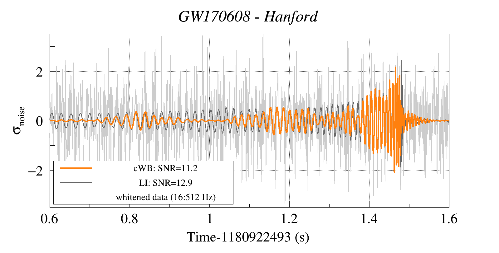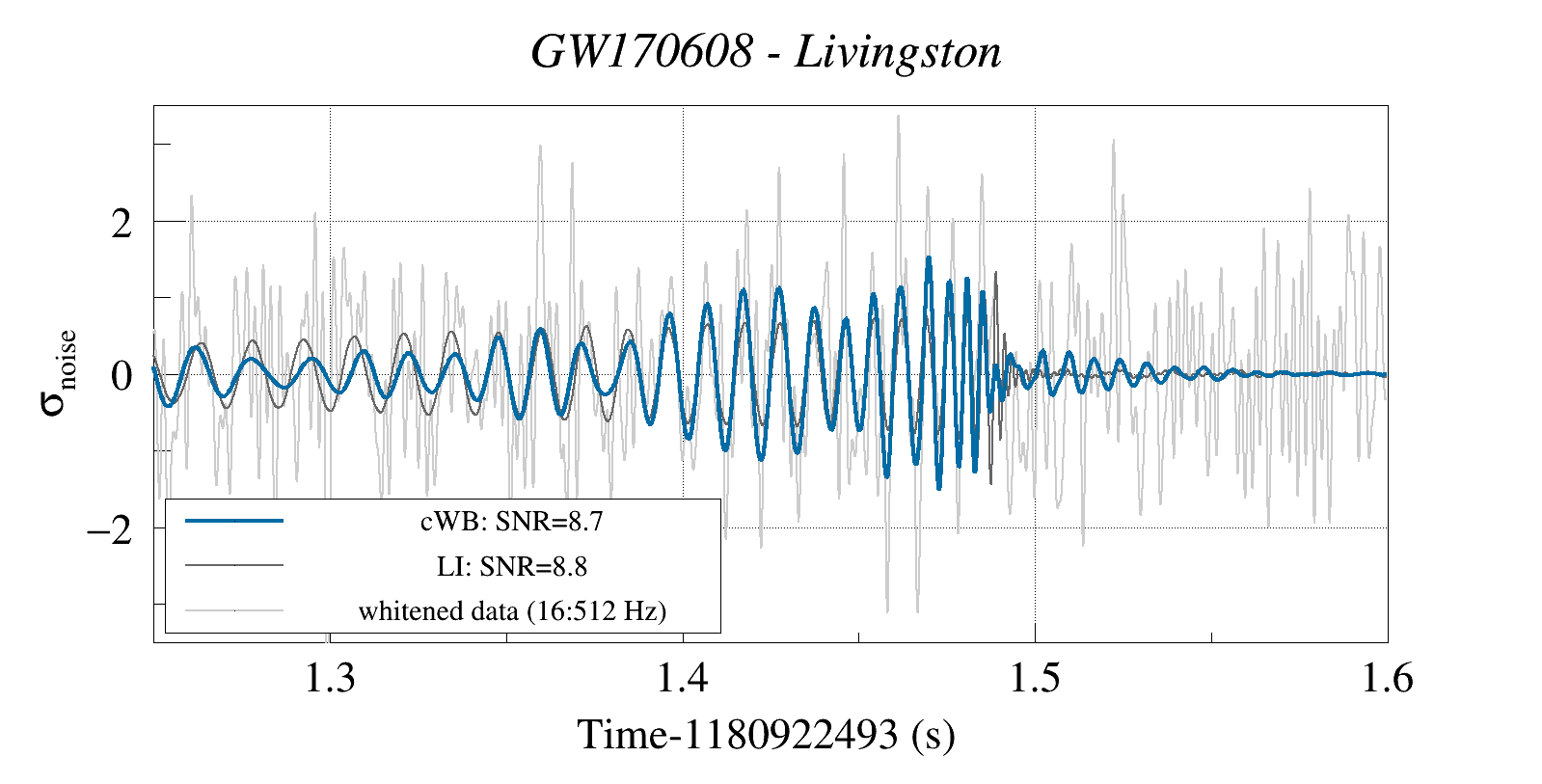 (cWB max-likelihood) vs (LALInference max-likelihood) vs (whitened data 16:512 Hz)