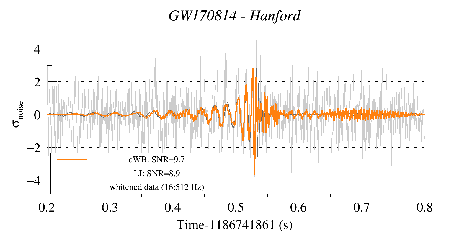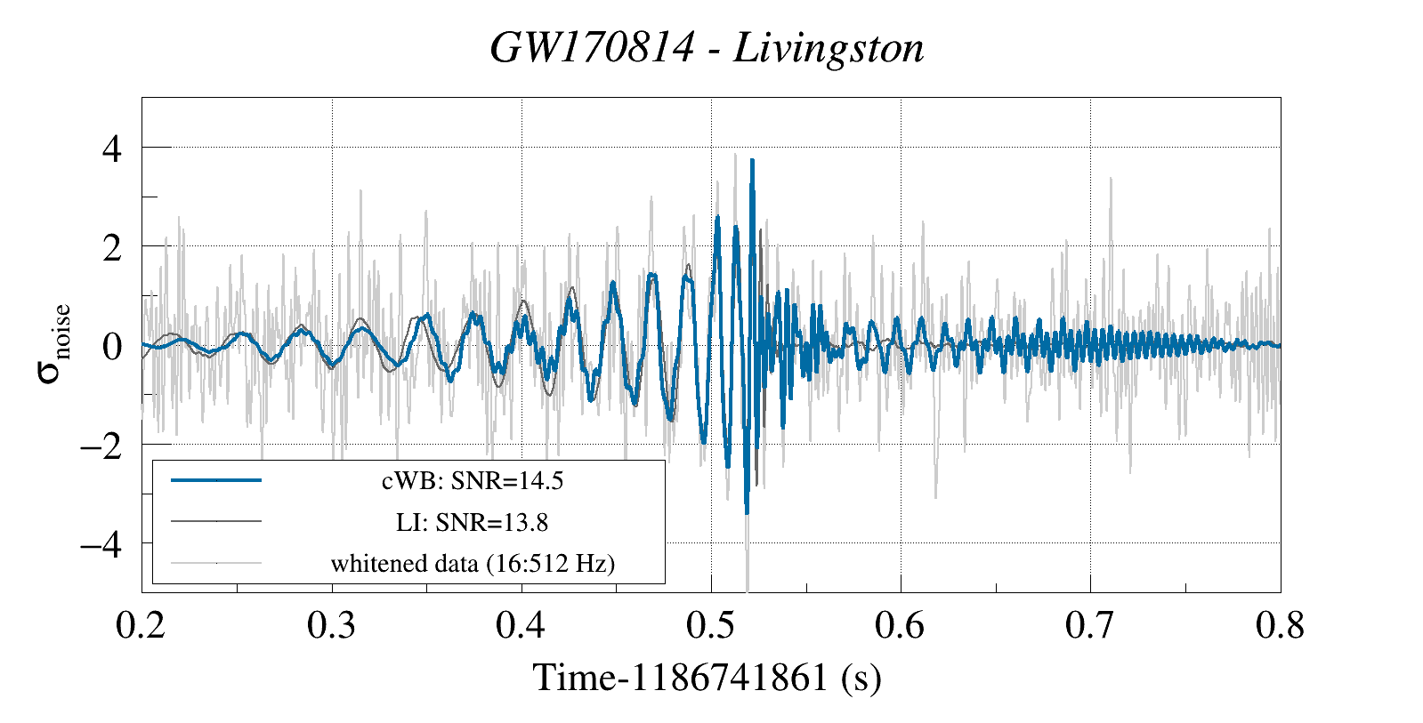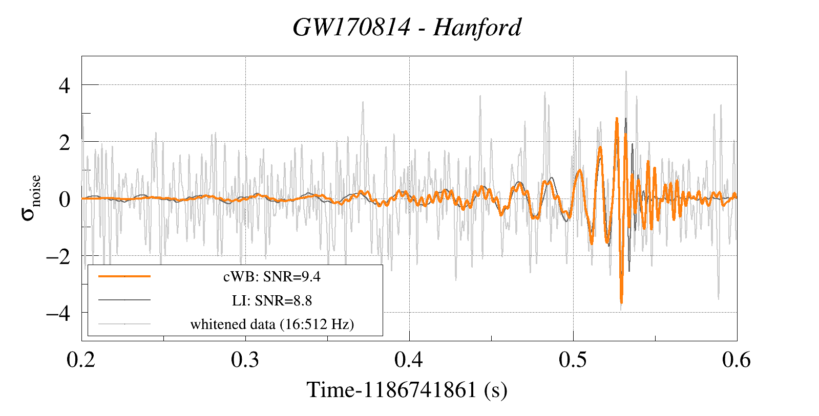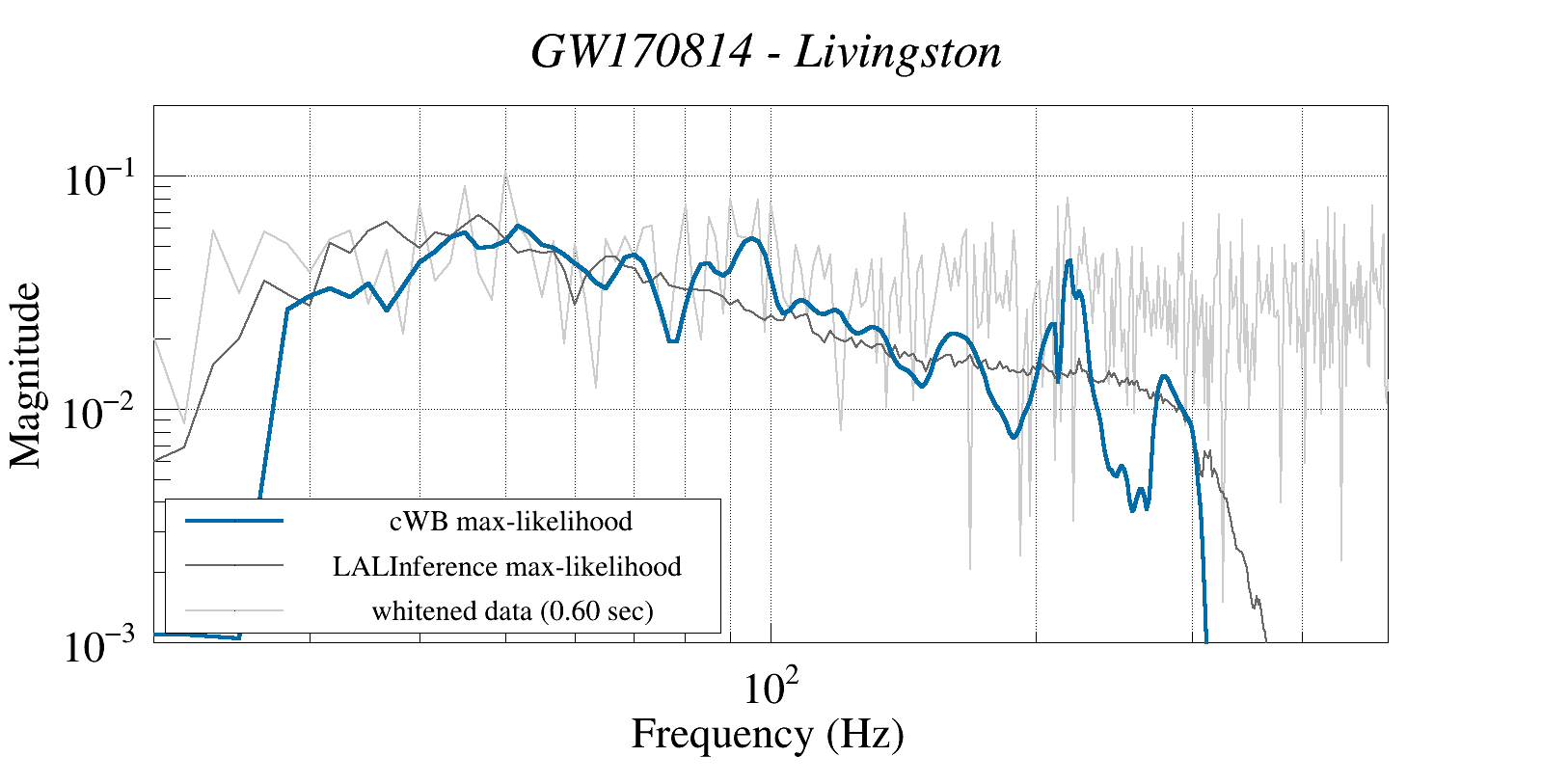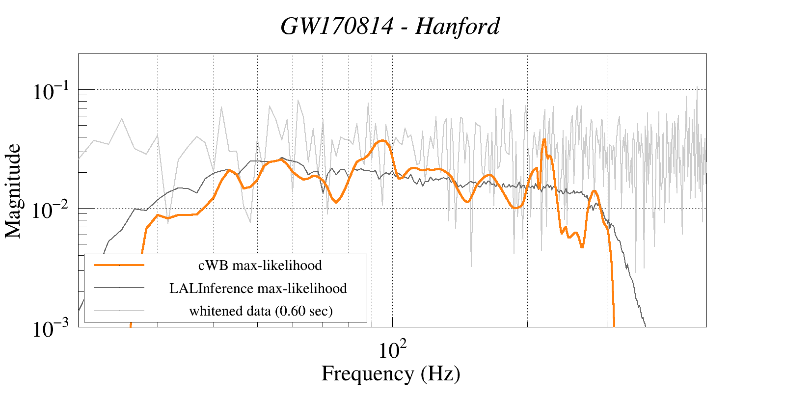 (cWB max-likelihood) vs (LALInference max-likelihood) vs (whitened data 16:512 Hz)