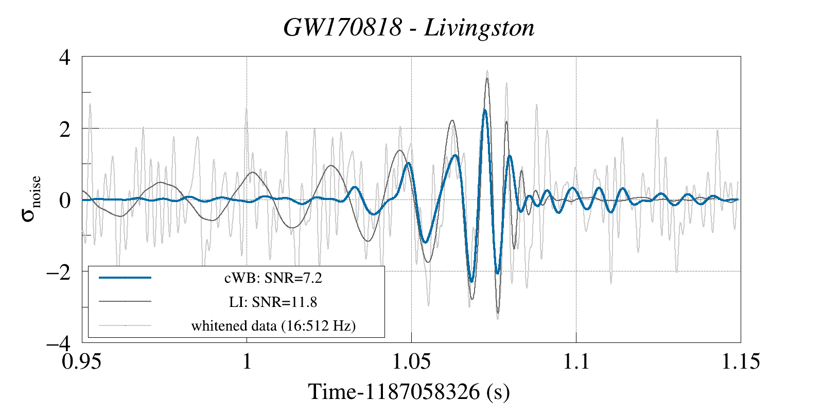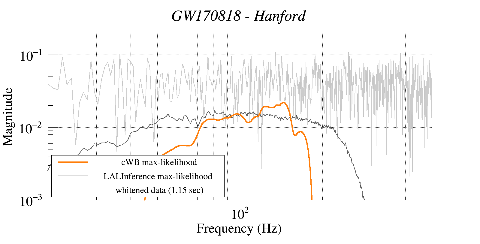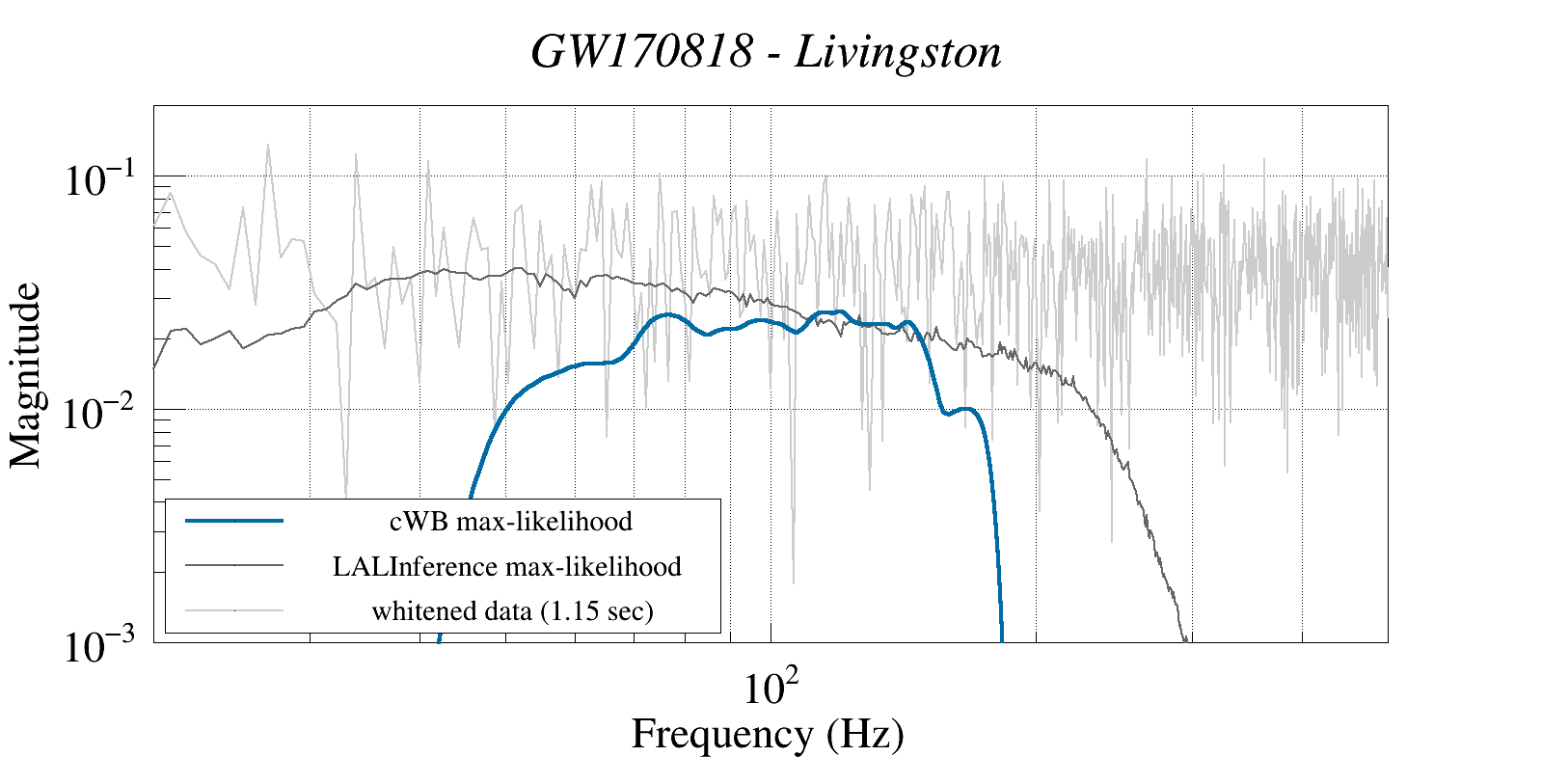 (cWB max-likelihood) vs (LALInference max-likelihood) vs (whitened data 16:512 Hz)