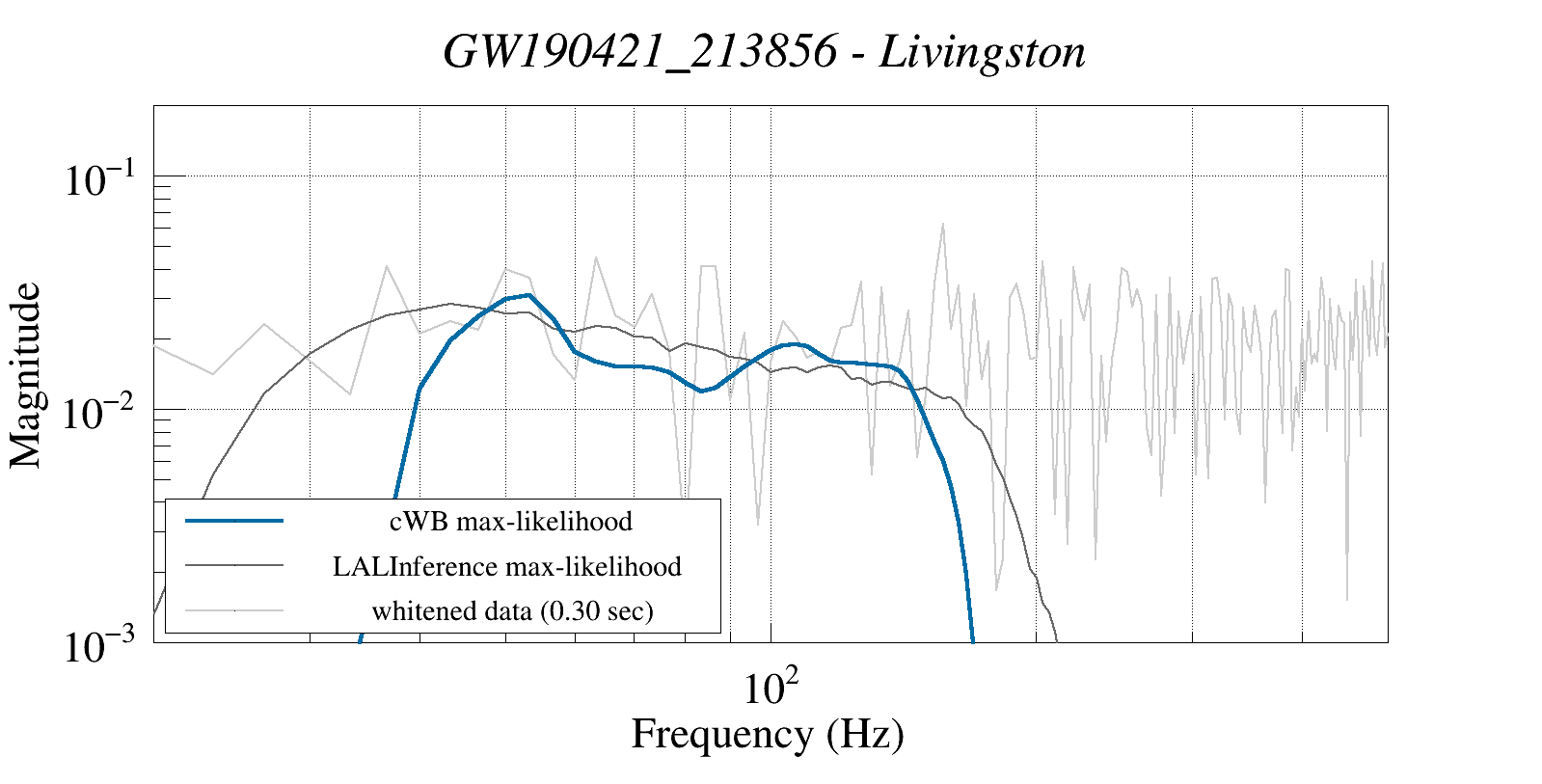 (cWB max-likelihood) vs (LALInference max-likelihood) vs (whitened data 16:512 Hz)
