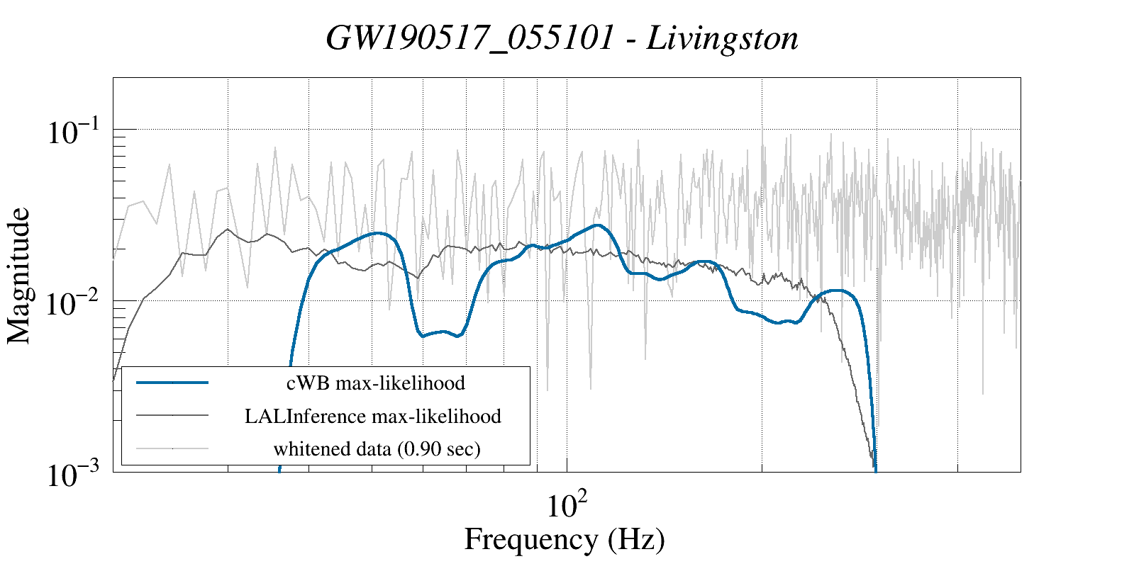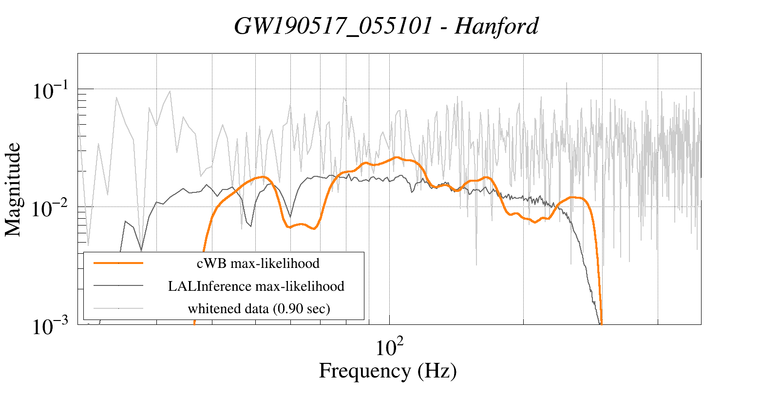 (cWB max-likelihood) vs (LALInference max-likelihood) vs (whitened data 16:512 Hz)