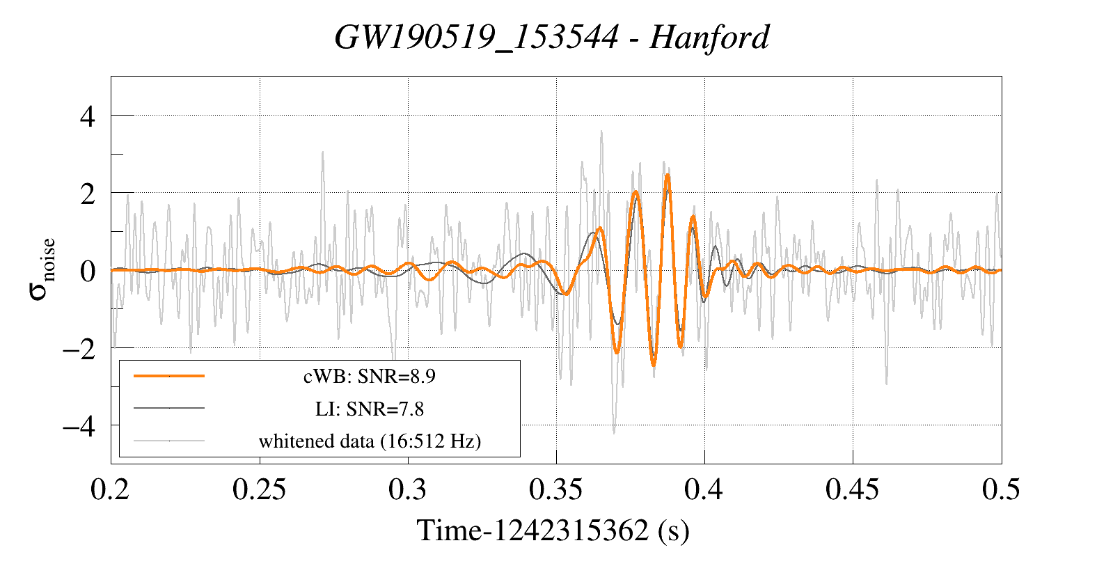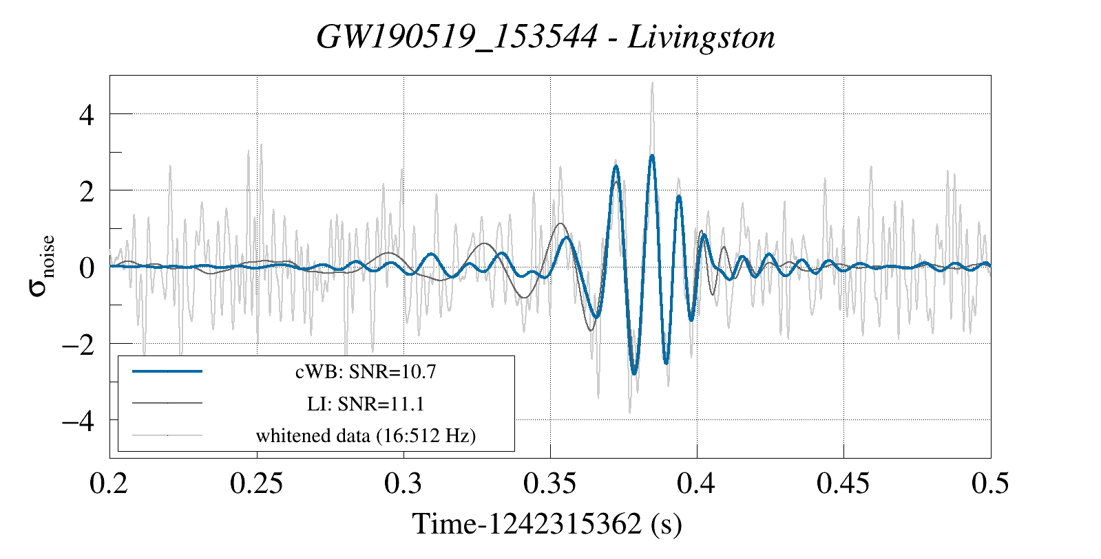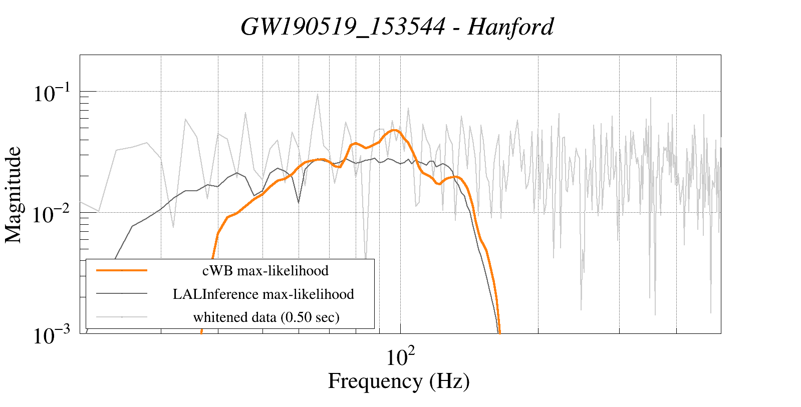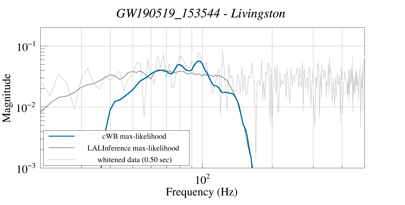 (cWB max-likelihood) vs (LALInference max-likelihood) vs (whitened data 16:512 Hz)