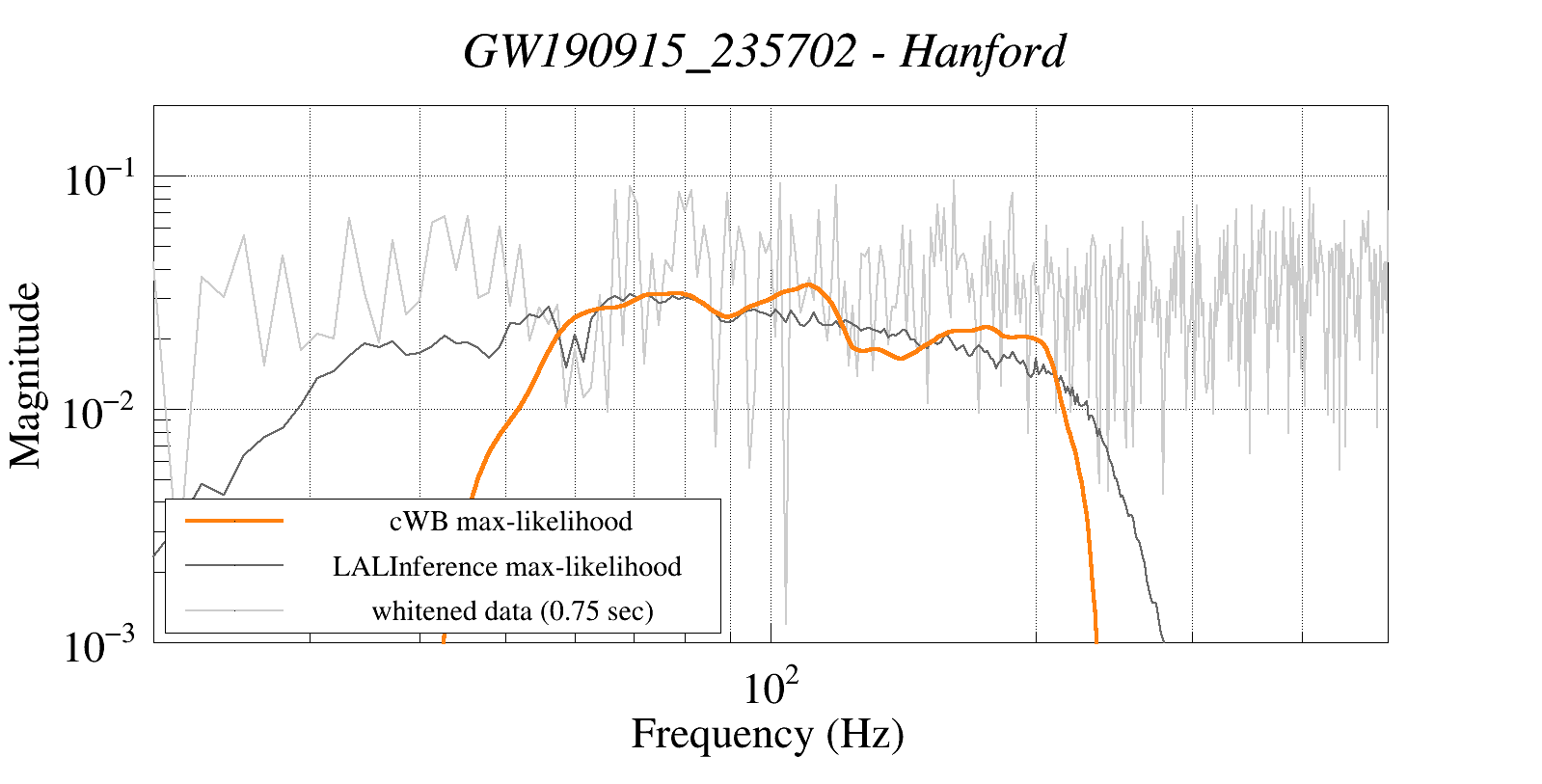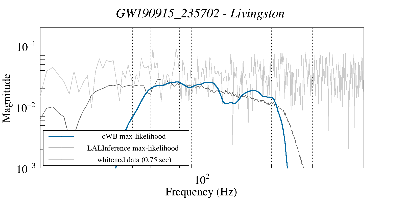 (cWB max-likelihood) vs (LALInference max-likelihood) vs (whitened data 16:512 Hz)