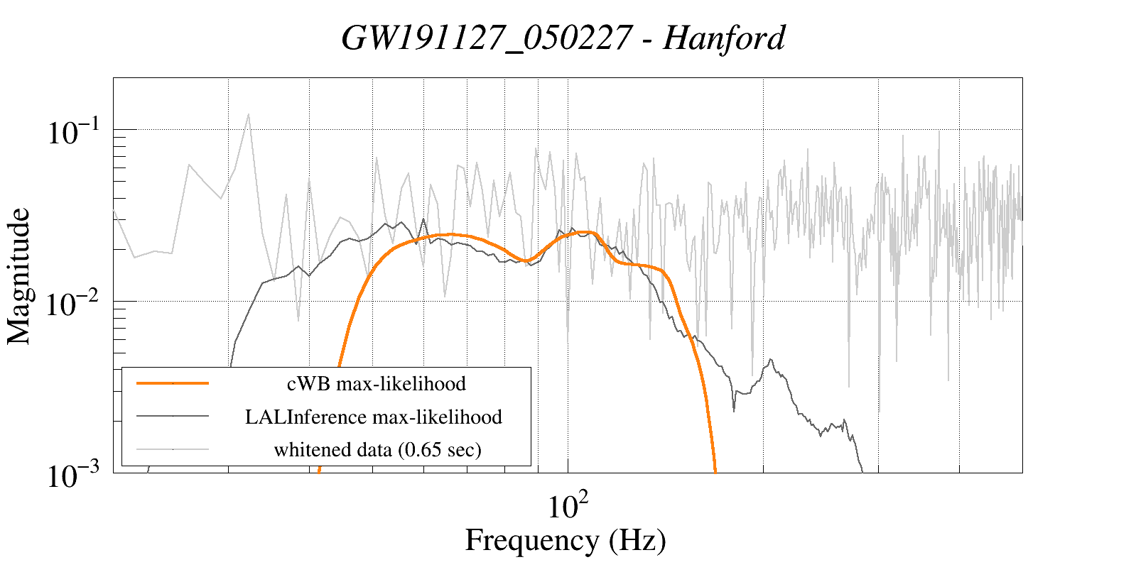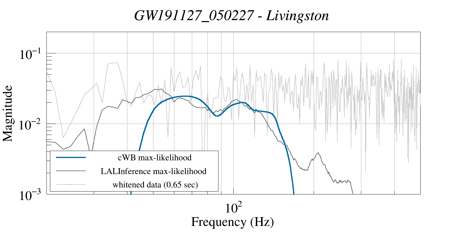 (cWB max-likelihood) vs (LALInference max-likelihood) vs (whitened data 16:512 Hz)